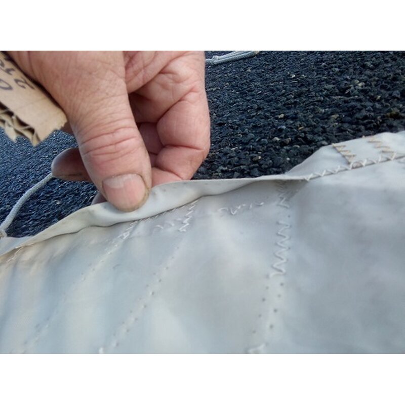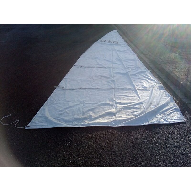 Das Segel ist heile, kann noch gesegelt werden, ich schätze den Zustand auf gute 4.